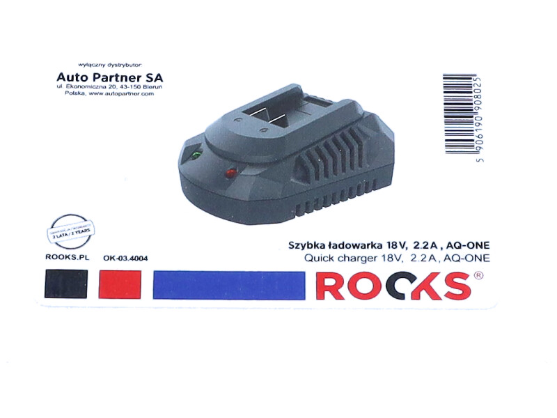 ROOKS OK-03.4004 to szybka ładowarka do systemu 18V AQ-ONE, zaprojektowana z myślą o użytkownikach narzędzi akumulatorowych, którzy cenią wydajność i bezpieczeństwo pracy. Ładowarka umożliwia pełne naładowanie akumulatora o pojemności 2 Ah w zaledwie 60 minut, co znacząco przyspiesza pracę w warsztacie lub na budowie.