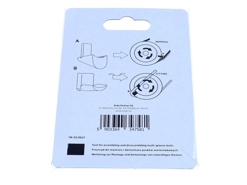 ROOKS OK-02.0627 to profesjonalny przyrząd przeznaczony do montażu i demontażu elastycznych pasków wielorowkowych, stosowanych w nowoczesnych samochodach osobowych i dostawczych. Narzędzie wykonane zostało z wyjątkowo twardego i trwałego nylonu technicznego, który zapewnia odpowiedni poślizg paska na powierzchni montażowej, minimalizując ryzyko jego uszkodzenia. To ekonomiczne, niezawodne i niezwykle praktyczne rozwiązanie – dwa narzędzia w jednym.