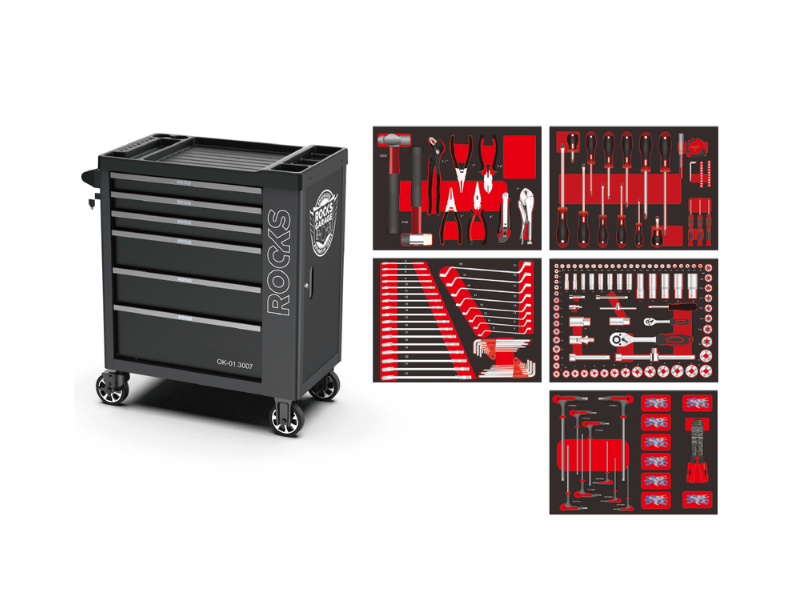 Szafka narzędziowa ROOKS OK-01.3007 GARAGE BLACK to kompleksowe rozwiązanie dla wymagających użytkowników, którzy cenią sobie porządek, wygodę i niezawodność. Wyposażona w 387 starannie dobranych narzędzi, pozwala na łatwe przechowywanie, organizację i szybki dostęp do wszystkich niezbędnych akcesoriów podczas codziennych prac serwisowych, naprawczych i montażowych.