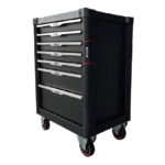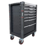 Twoje mobilne centrum dowodzenia: Solidne, aluminiowe koła z hamulcami pozwalają bez wysiłku przemieszczać szafkę dokładnie tam, gdzie jest potrzebna. Po ustawieniu, jednym ruchem blokujesz koła, zapewniając pełną stabilność. Wytrzymały blat roboczy ze stali nierdzewnej to idealne miejsce na szybkie naprawy i prace montażowe.