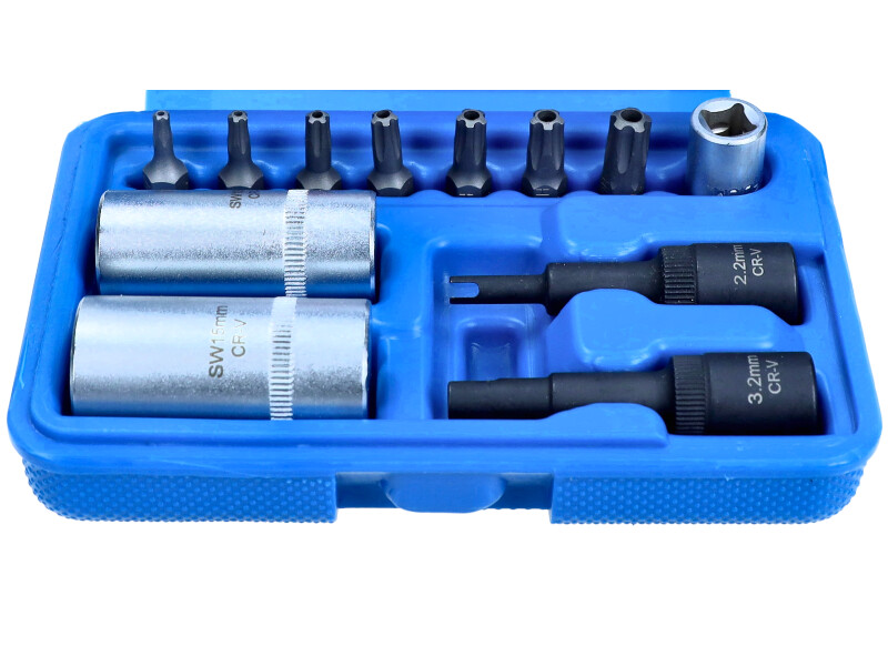 ROOKS OK-02.0900 to profesjonalny zestaw 12 kluczy przeznaczonych do obsługi zaworów klimatyzacji w pojazdach. Komplet zawiera klucze o różnych rozmiarach, umożliwiające precyzyjną i wygodną pracę przy serwisowaniu układów klimatyzacyjnych. Zestaw obejmuje nasadki ośmiokątne (12 i 15 mm), nasadki ampułowe (2,2 oraz 3,2 mm) oraz bity pięciokątne TORX5: TS10, TS15, TS20, TS25, TS27, TS30, TS40.