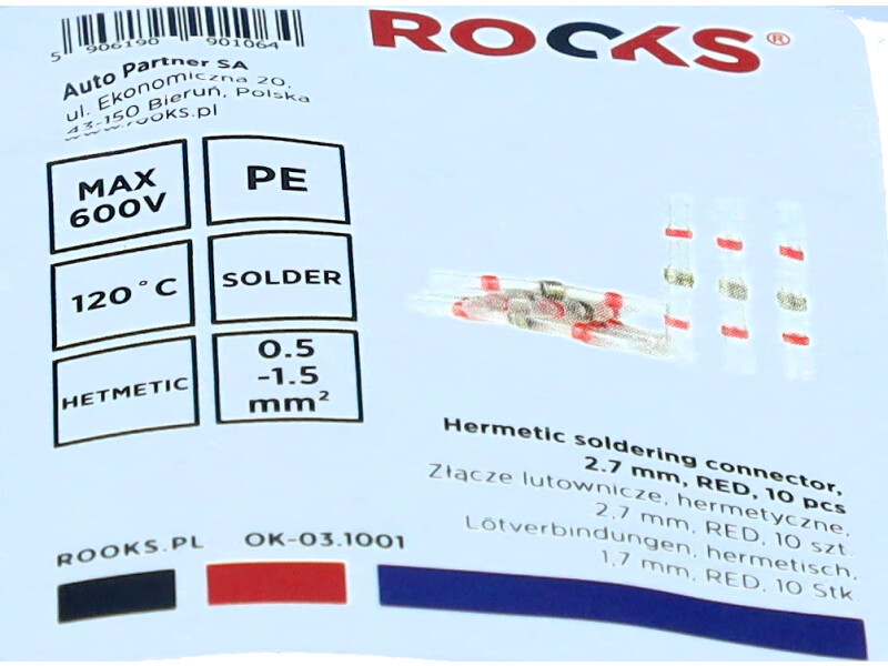 Złącza ROOKS OK-03.1001 zostały zaprojektowane z myślą o wygodzie i bezpieczeństwie użytkownika. Hermetyczna konstrukcja chroni połączenie przed wilgocią i korozją, a zastosowanie lutu cynowego gwarantuje trwałość i wysoką przewodność elektryczną.