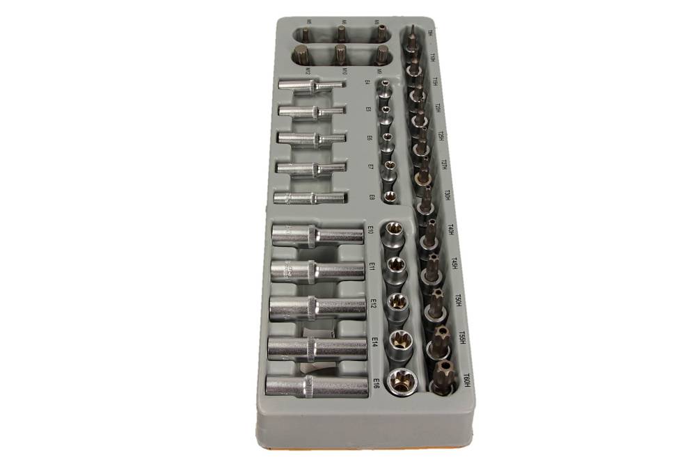 Nasadki wykonane są z wysokogatunkowej stali chromowo-wanadowej (CrV), odpornej na odkształcenia i korozję, co gwarantuje długą żywotność i niezawodność nawet przy intensywnej eksploatacji. Całość umieszczono w modułowym wkładzie piankowym 1/3, dopasowanym do szuflad wózków narzędziowych, który zapewnia porządek, bezpieczeństwo i wygodny dostęp do każdego elementu.